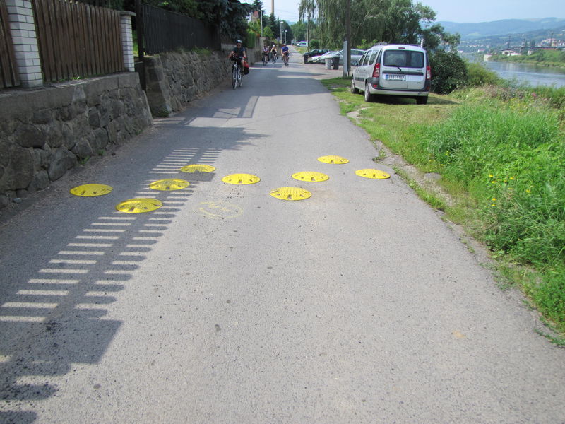 W paru miastach tam, gdzie nie było możliwości wyznaczenia pasów lub budowy ścieżki, wskazano na jezdni zalecany tor ruchu dla ruchu rowerowego (u nas też takie są – na razie tylko we Wrocławiu [zobacz >>>]). Na zdjęciu Děčín.
